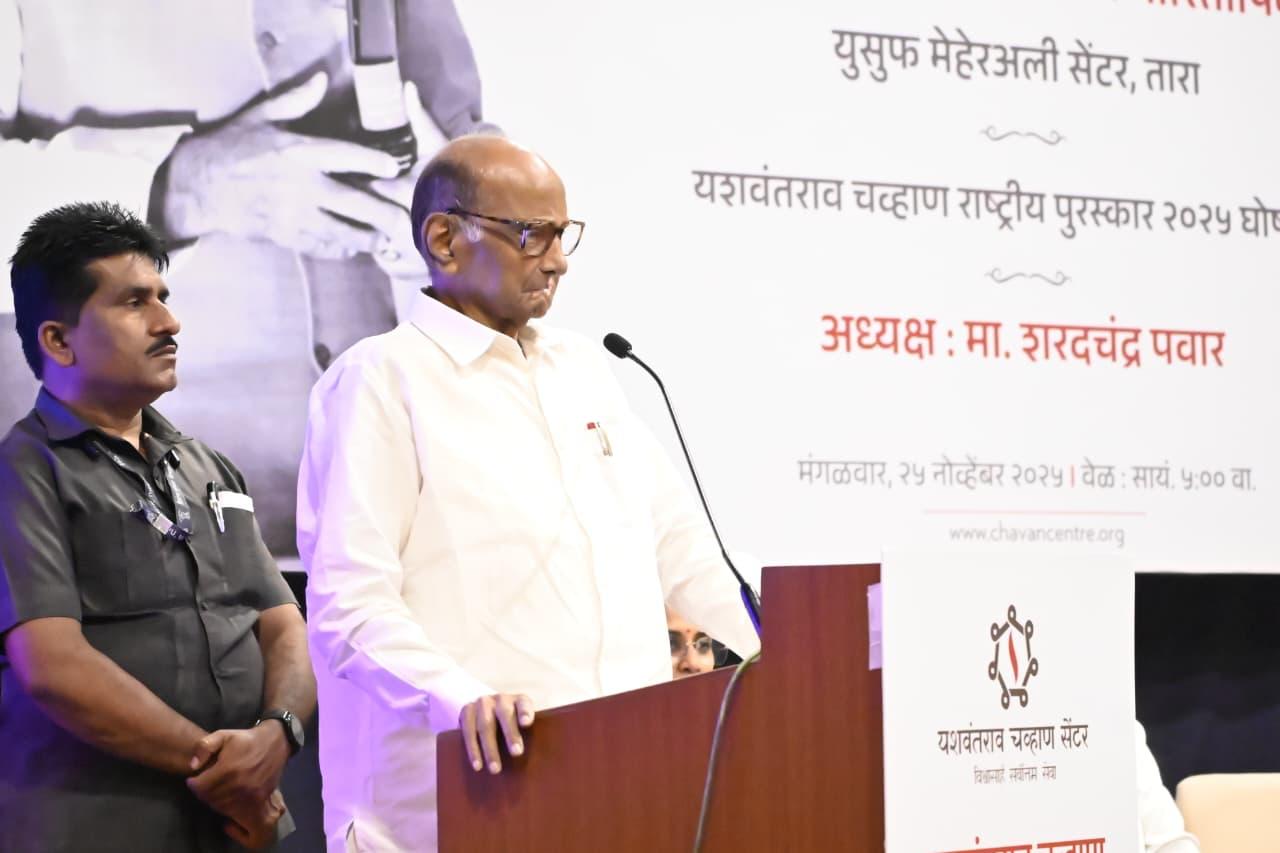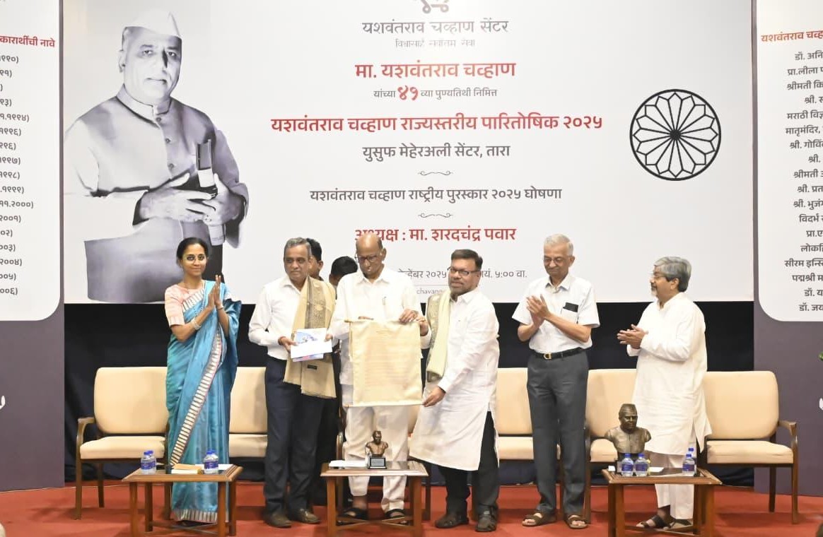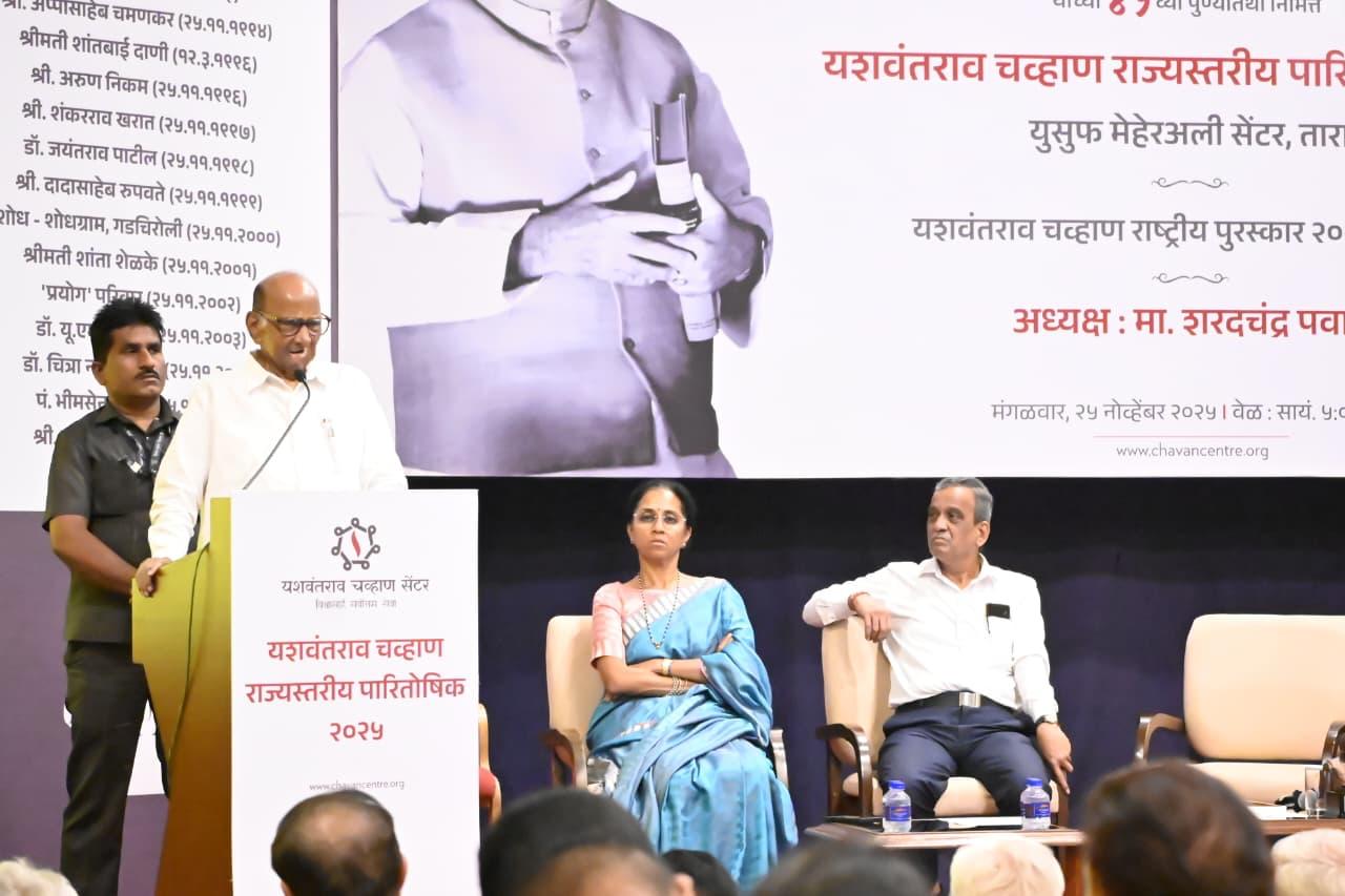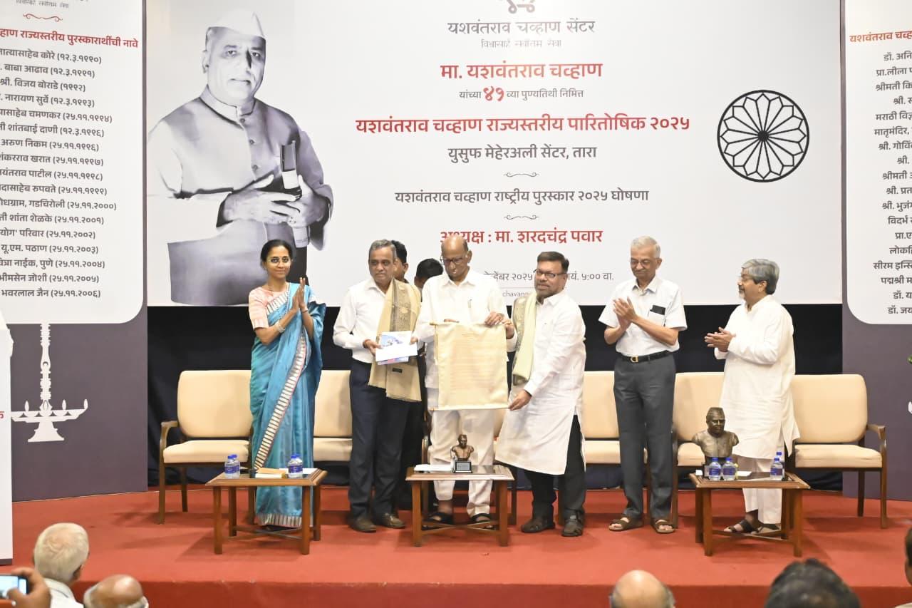 मुंबई, ता. २५: खेड्यापाड्यातल्या लोकांना त्यांचे मूलभूत प्रश्न सोडवण्याच्यासाठी आणि स्वतःच्या पायावर उभं करण्याच्यासाठी 'युसुफ मेहेरअली' संस्थेने आणि सगळ्या सहकाऱ्यांनी अविरत कष्ट केले आणि ही संस्था एका उत्तम पातळीवर आणून पोहोचवली. ज्या ज्या वेळेला देशामध्ये संकट आलं, अडचणी आल्या त्या वेळेला 'युसुफ मेहेरअली सेंटर' तिथे धावून गेलं आणि आपली जबाबदारी ही त्यांनी लोकांना दाखवली, असे गौरवोद्गार ज्येष्ठ नेते शरद पवार यांनी काढले. यशवंतराव चव्हाण सेंटरच्या वतीने दिले जाणारे ‘यशवंतराव चव्हाण राज्यस्तरीय पारितोषिक २०२५’ ‘युसूफ मेहेरअली सेंटर, तारा’ यांना पवार यांच्या हस्ते प्रदान करण्यात आला. दोन लाख रुपये रोख आणि मानपत्र असे या पुरस्काराचे स्वरूप आहे.