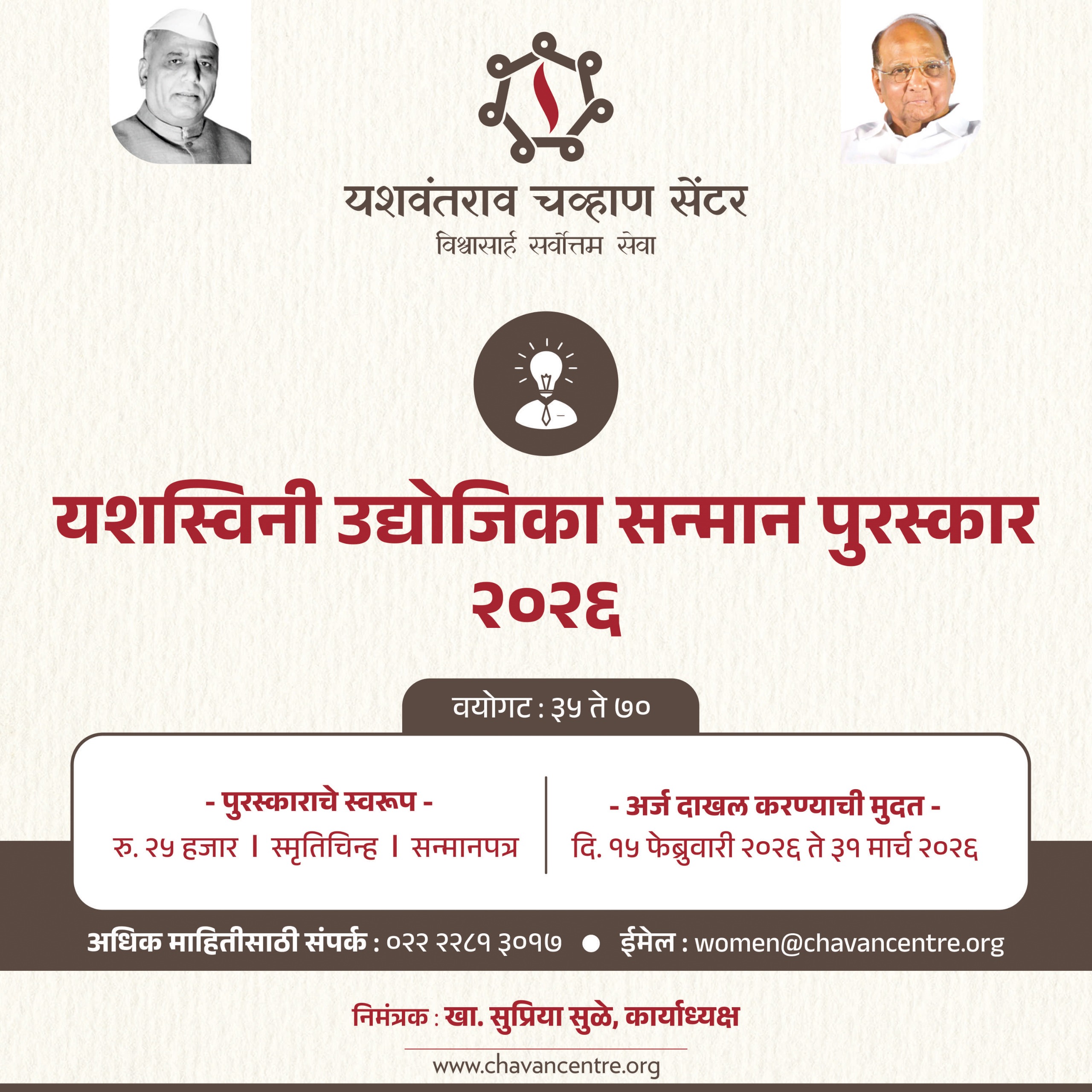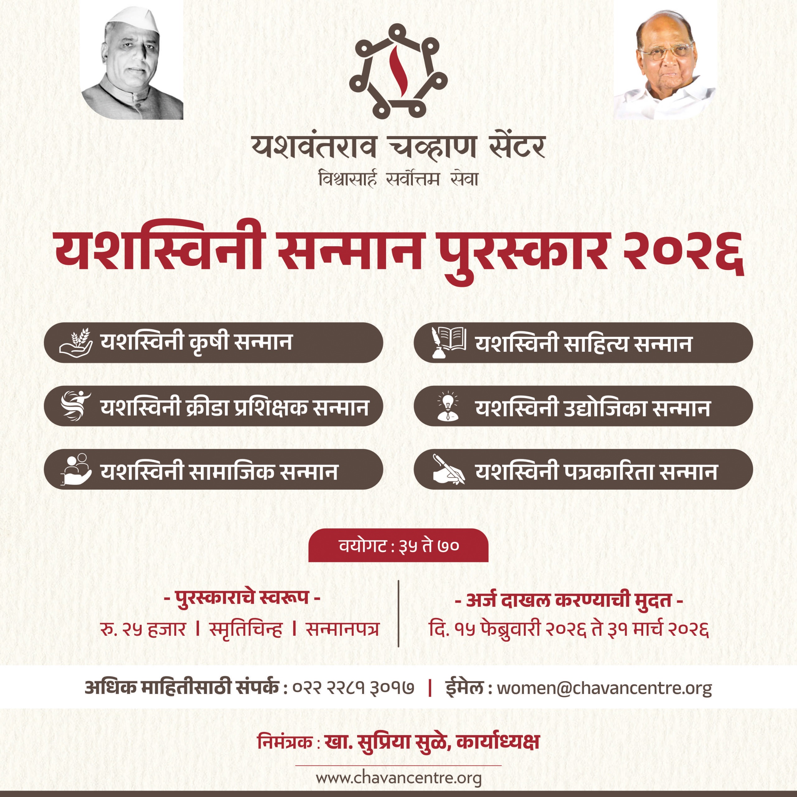 यशवंतराव चव्हाण सेंटरच्या वतीने स्त्री-शक्ती ला सलाम करण्यासाठी यशस्विनी सन्मान पुरस्काराची सुरुवात करण्यात आली आहे. यावर्षीच्या म्हणजेच पाचव्या वर्षीच्या पुरस्कारासाठी अर्ज मागविण्यात येत आहेत. कृषी, साहित्य, सामाजिक कार्य, क्रीडा प्रशिक्षण, उद्योग आणि पत्रकारिता या क्षेत्रातील कर्तृत्ववान महिलांचा या पुरस्काराने सन्मान करण्यात येणार आहे.