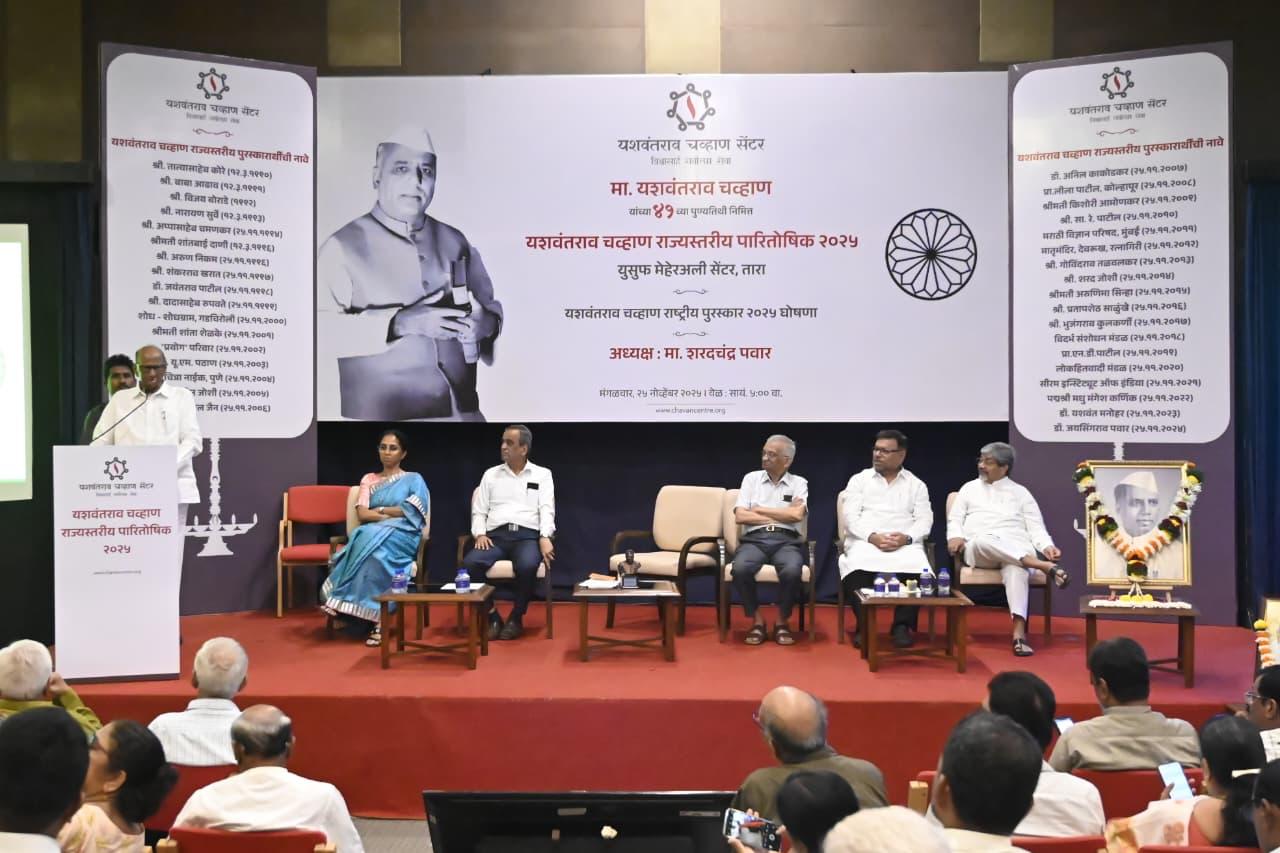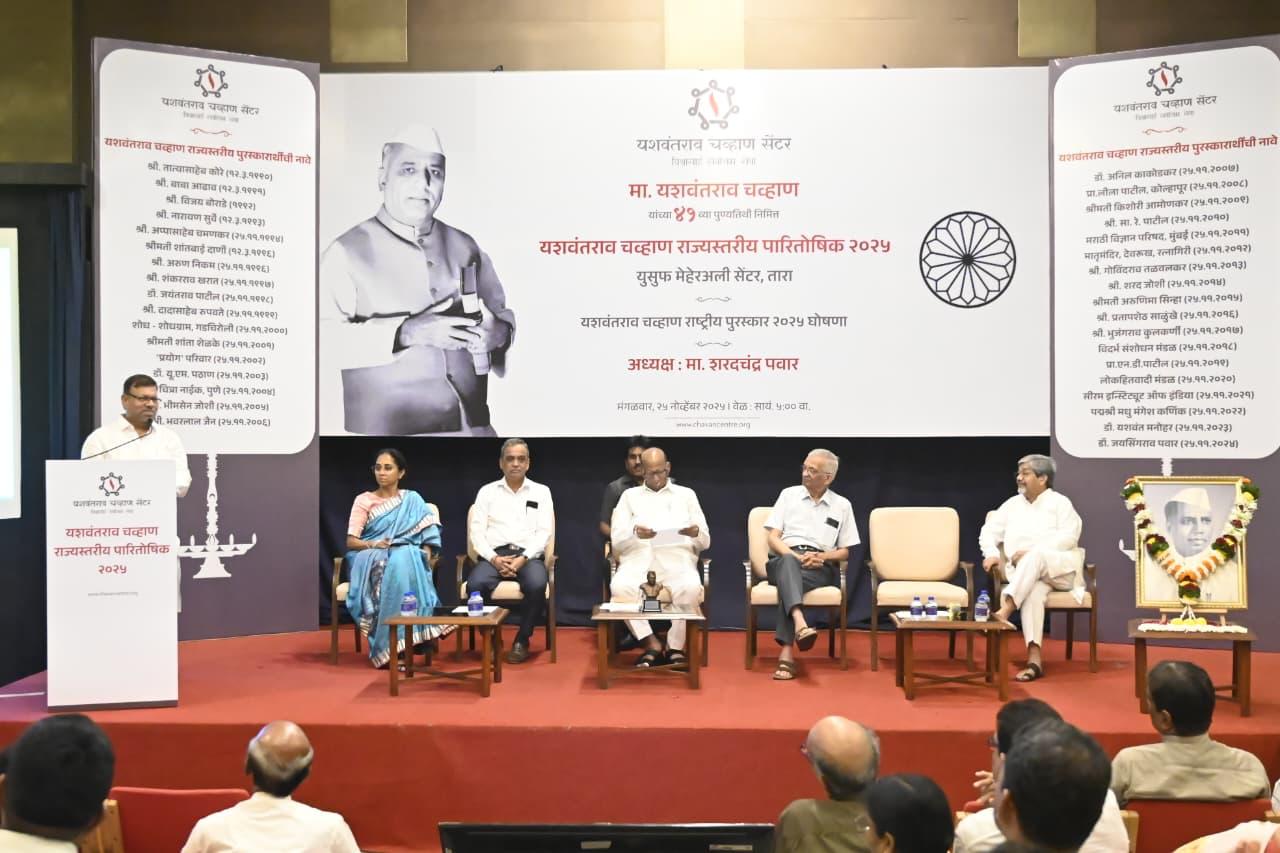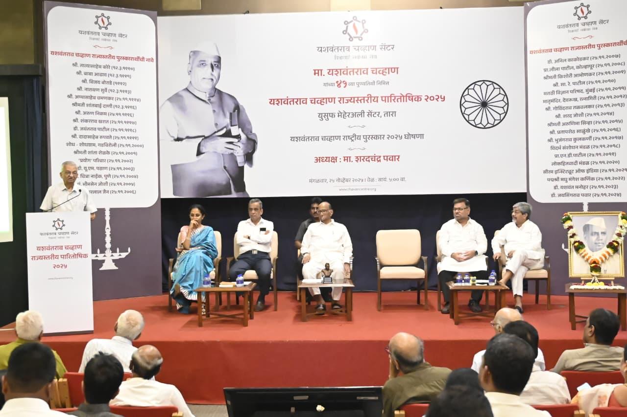मुंबई, ता. २५: खेड्यापाड्यातल्या लोकांना त्यांचे मूलभूत प्रश्न सोडवण्याच्यासाठी आणि स्वतःच्या पायावर उभं करण्याच्यासाठी 'युसुफ मेहेरअली' संस्थेने आणि सगळ्या सहकाऱ्यांनी अविरत कष्ट केले आणि ही संस्था एका उत्तम पातळीवर आणून पोहोचवली. ज्या ज्या वेळेला देशामध्ये संकट आलं, अडचणी आल्या त्या वेळेला 'युसुफ मेहेरअली सेंटर' तिथे धावून गेलं आणि आपली जबाबदारी ही त्यांनी लोकांना दाखवली, असे गौरवोद्गार ज्येष्ठ नेते शरद पवार यांनी काढले. यशवंतराव चव्हाण सेंटरच्या वतीने दिले जाणारे ‘यशवंतराव चव्हाण राज्यस्तरीय पारितोषिक २०२५’ ‘युसूफ मेहेरअली सेंटर, तारा’ यांना पवार यांच्या हस्ते प्रदान करण्यात आला. दोन लाख रुपये रोख आणि मानपत्र असे या पुरस्काराचे स्वरूप आहे.